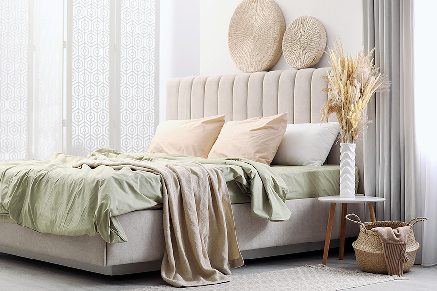 Находиться в пастельном интерьере легко и спокойно. Спальня выглядит изящно и нежно с кроватью и мягкой обивкой. Высокая спинка создает ощущение комфорта, а текстиль — уюта. Отличным дополнением такого дизайна стал комплект журнальных столиков, который можно использовать для декора или личных вещей.